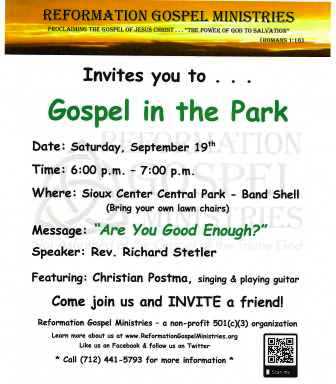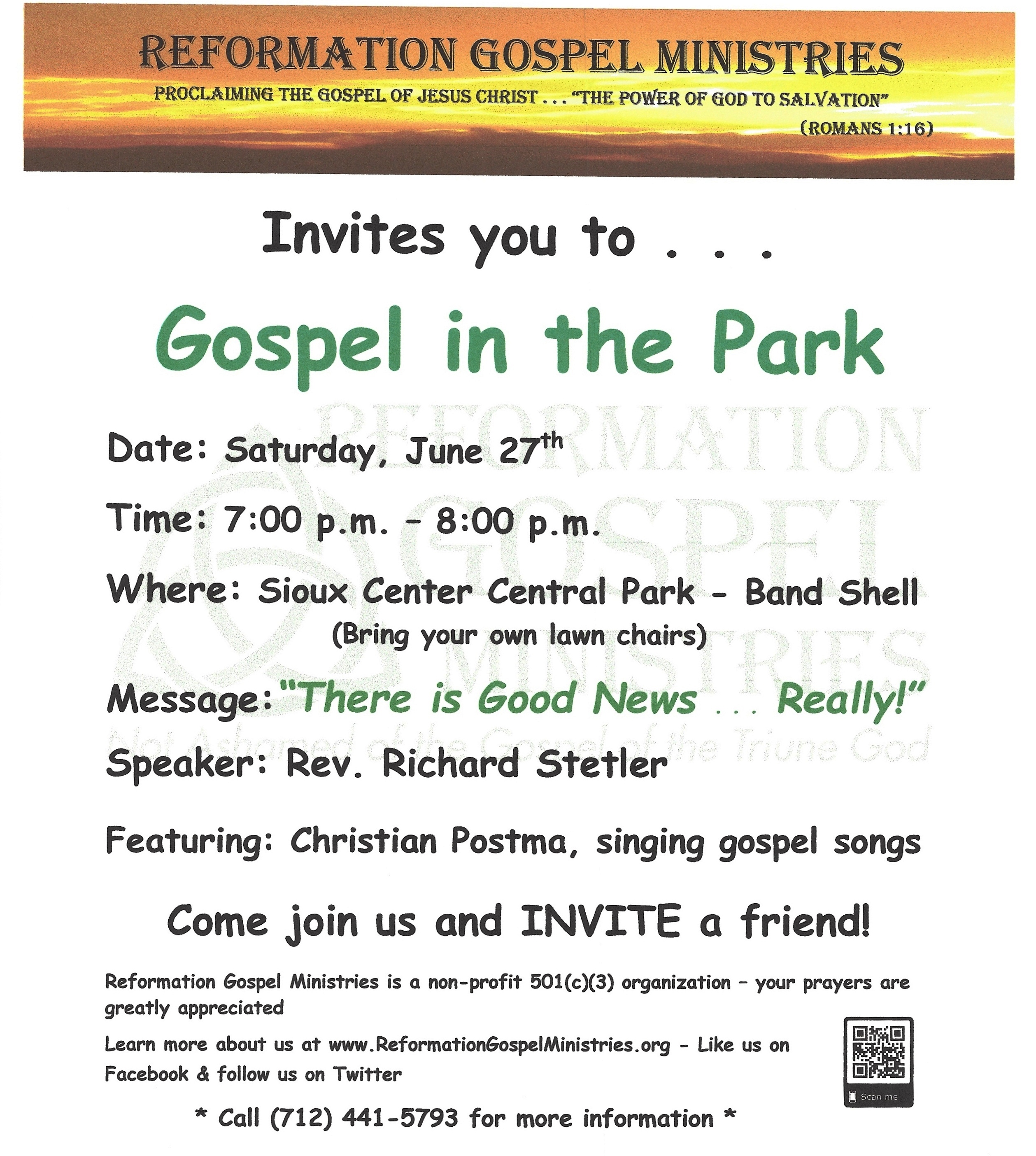 17th – Gospel in the Park (Sioux Center Park Band Shell) – Gospel message & music