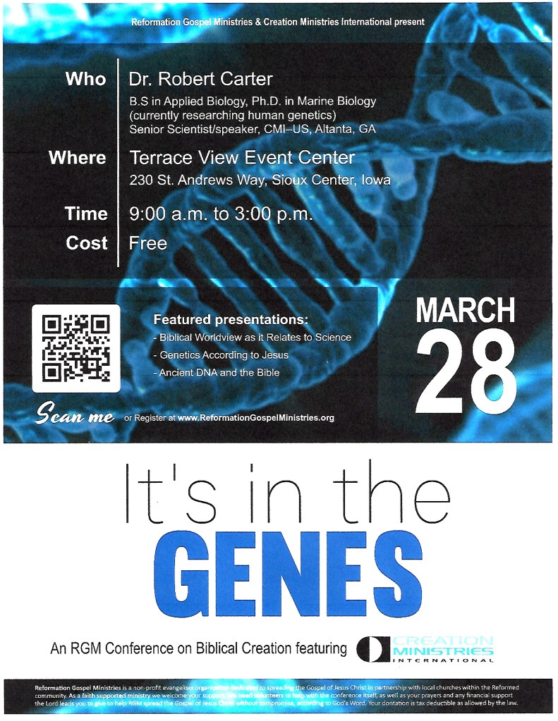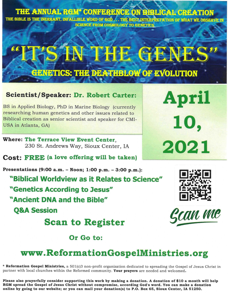 10th – Conference on Biblical Creation – “It’s in the Genes” – Dr. Robert Carter of Creation Ministries International, the speaker at the Terrace View Event Center, Sioux Center, IA