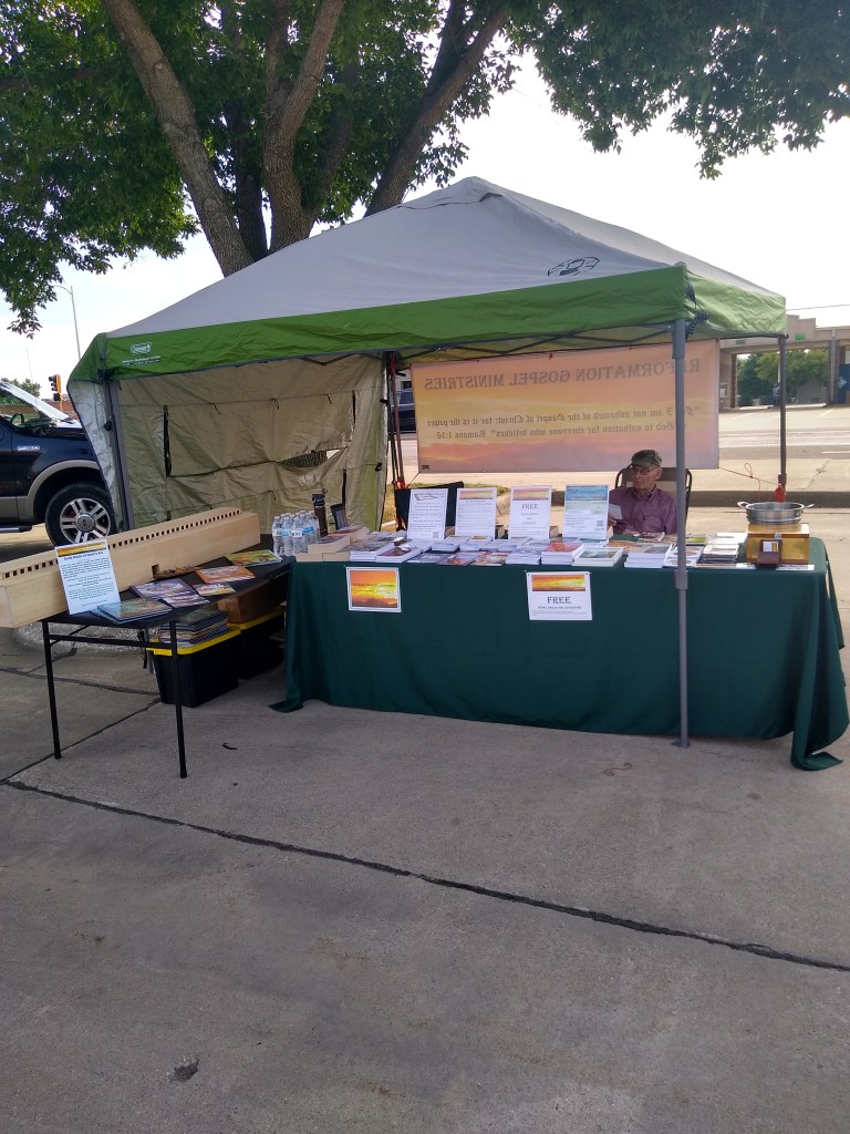 On the 14th of July, we had a booth at the Sioux Center Farmers Market (not doing very well in the picture taking category). The market is held every Wednesday in the parking lot of the Sioux Center Centre Mall, IA. We (Harlan DeBoer and I) put up the canopy and set out 2 tables full of books and material to give away. We had lots of visitors with whom we had great conversations concerning the Gospel of Jesus Christ. We gave a way Bibles, books and other literature to help people witness the Gospel of Jesus Christ. All of our Bible, books and material are free. Several hundred dollars of books and material were given away thanks to the generous donations from individuals and churches. Your monthly donations are greatly appreciated.