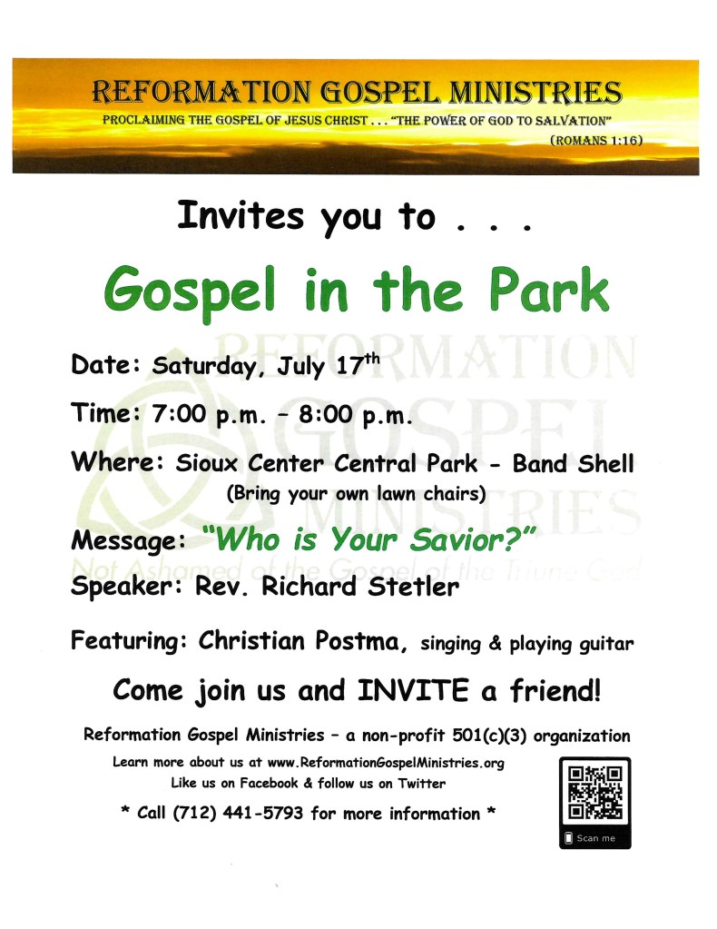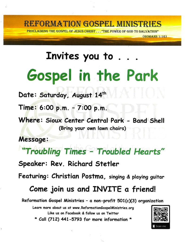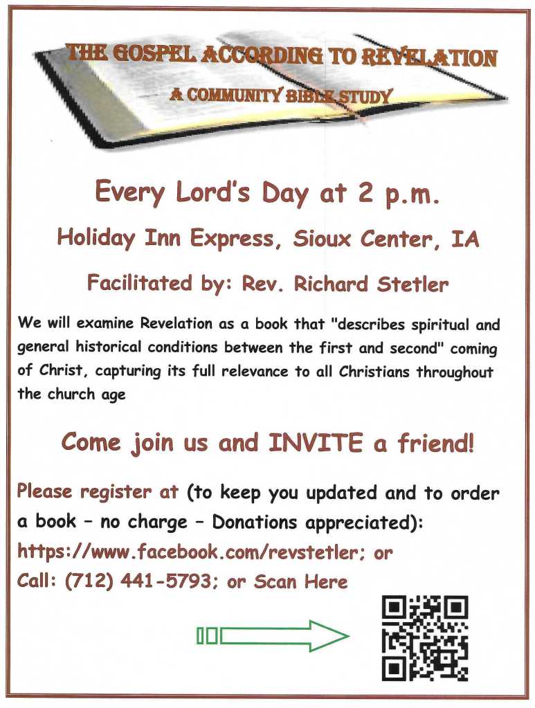 We continue to hold our weekly Bible study when I’m not preaching at churches out of town. We are studying the Book of Revelation and have titled the study, “The Gospel According to Revelation.” We meet every Lord’s Day at 2 p.m. at the Holiday Inn in Sioux Center, IA. You can contact Rev. Stetler by email at refgosmin@gamil.com or by phone at (712) 441-5793 for more information and any updates as to where we are in the study and when the next meeting will be.