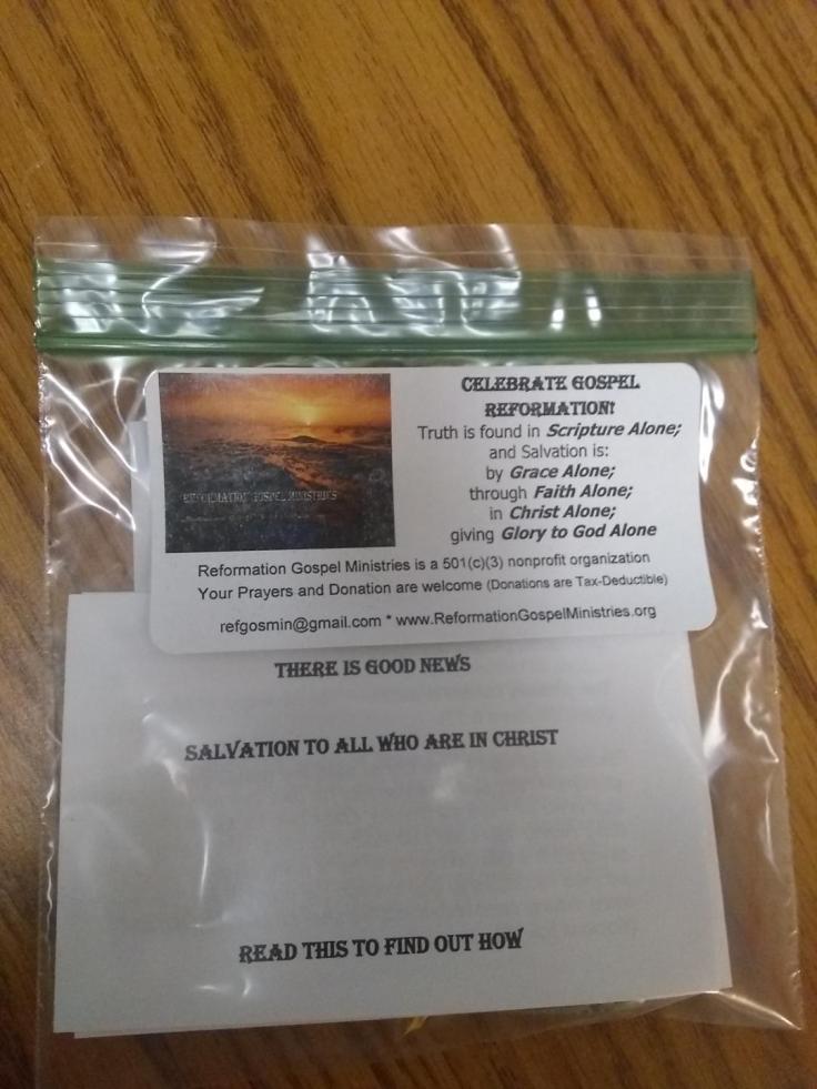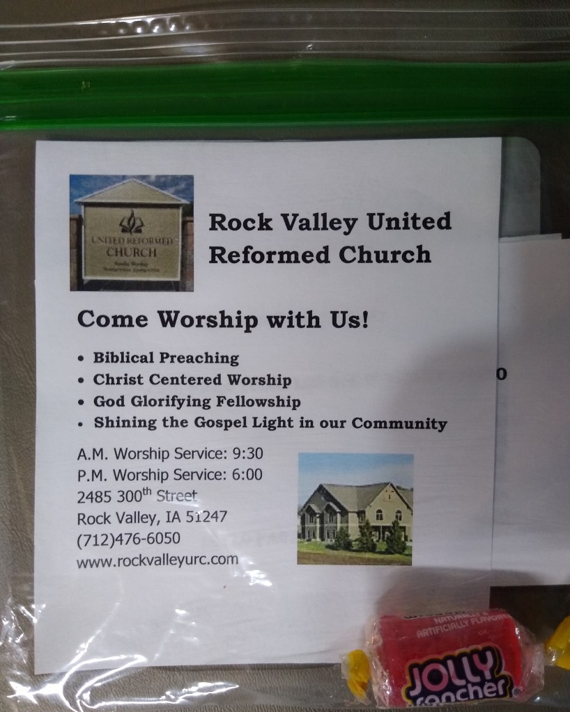 Upper center & right: The gospel bags contained a gospel tract (in English & Spanish), candy and an invitation to worship at RVURC, Rock Valley, IA
