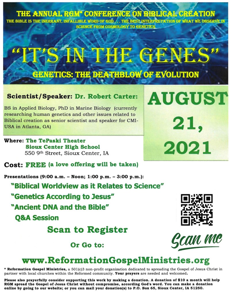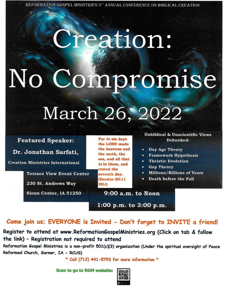 - The Annual Creation Conference has been scheduled for March 26, 2022 at the Terrace View Event Center, Sioux Center, IA. The title of the conference will be: “Biblical Creation: No Compromise” – The focus of the conference will be on how to answer those who hold to compromise views of the creation account of Genesis. The speaker will be Dr. Jonathan Sarfati of Creation Ministries International. He has written several books on creation including the book, “Refuting Compromise.” It will be an encouragement to all believers as we fight a spiritual battle against the lies and deceptions of the devil through his ministers that disguise themselves as “ministers of light.”