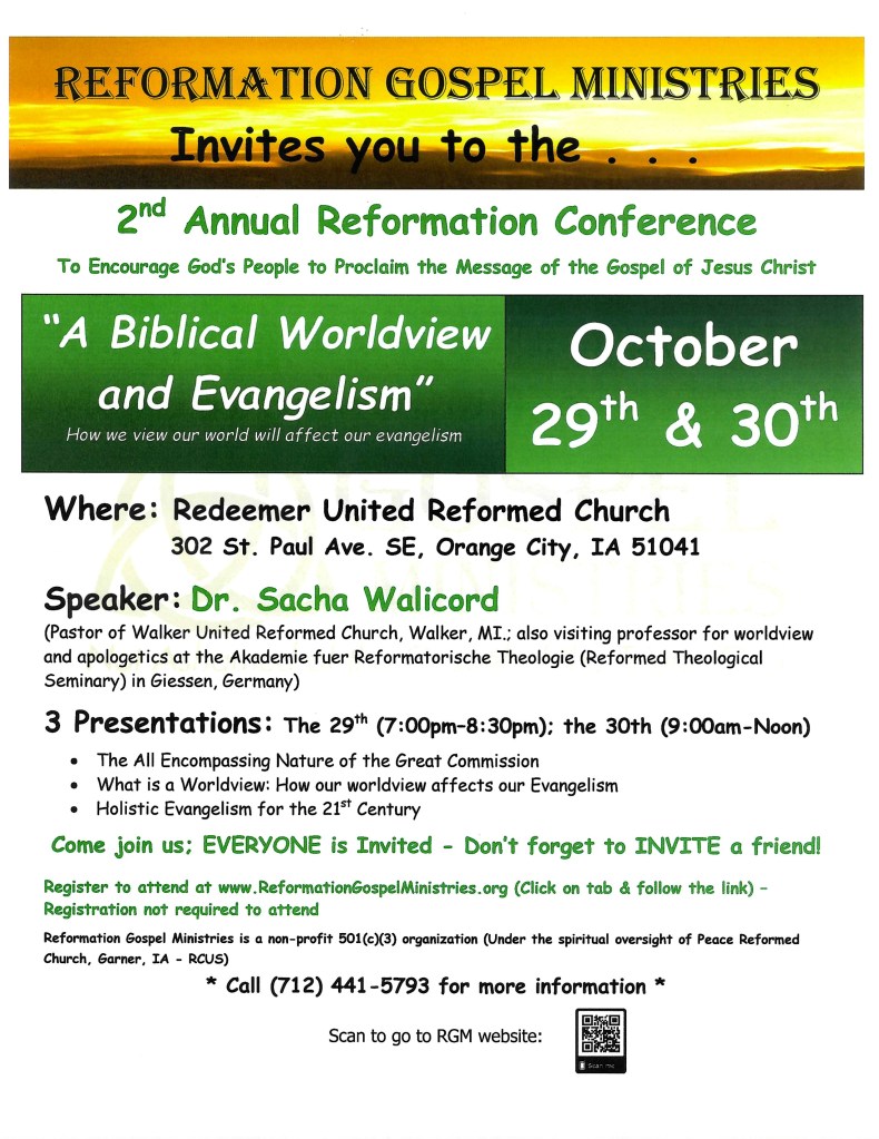 The Fall Reformation Conference on October 29th and 30th – Friday Evening, beginning at 7:00 p.m. and Saturday morning, beginning at 9:00 a.m. The location of this conference will be at Redeemer United Reformed Church, Orange City, IA. The title of the conference will be, “Biblical Worldview and Evangelism.” It will focus on the Christian worldview and how it affects our evangelism individually and as a church. The speaker is Dr. Sacha Walicord, a former professor at Dordt University and is a visiting professor for worldview and apologetics at the Akademie fuer Reformatorische Theologie (Reformed Theological Seminary) in Giessen, Germany. He is also a board member of RGM.