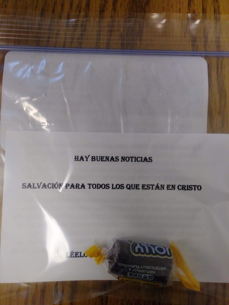 Someone (me) forgot to take pictures, again – will work on that in the future. Here is a picture of the typical bag with a tract (English and Spanish), and a piece of candy in it: