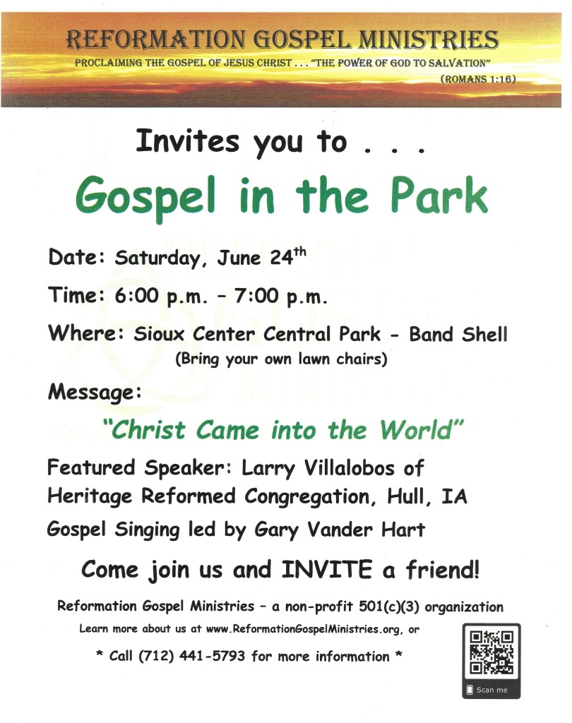 Gospel in the Park – June 24th NOTE: the time is incorrect – it should be 7:00 p.m. – 8:00 p.m Share this: Click to share on X (Opens in new window) X Click to share on Facebook (Opens in new window) Facebook Click to share on Tumblr (Opens in new window) Tumblr Click to share on Pinterest (Opens in new window) Pinterest Click to share on WhatsApp (Opens in new window) WhatsApp Click to share on LinkedIn (Opens in new window) LinkedIn Like Loading... Leave a comment Cancel reply Δ This site uses Akismet to reduce spam. Learn how your comment data is processed.