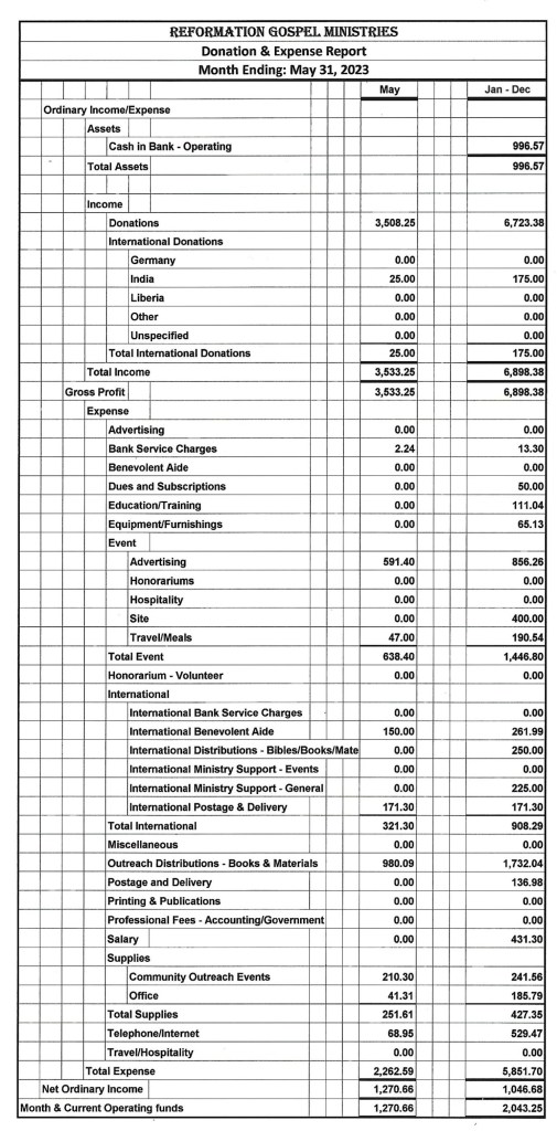 As you can see, we have a lot on our plate this year and a lot of costs that need to be covered. Everything that RGM does is free to the public, including giving away Bibles, books and other materials free of charge. We strictly donation funded. Please consider making a donation so we can continue to reach out to a lost world with gospel of Jesus Christ. This is especially important as we seek to continue to support evangelistic efforts in Liberia and India.