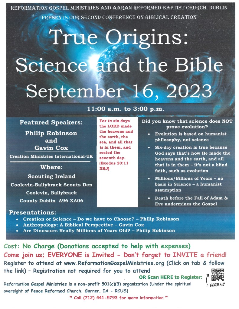 First, we are working with Aaran Reformed Baptist Church in Dublin, Ireland – Pastor Mark Fitzpatrick is the minister there. At this time, we are partnering with them to co-sponsor annual creation conferences (I wrote about the next one in September in the Ministry update a couple of days ago). The poster is below and the link to register for this event is also below: