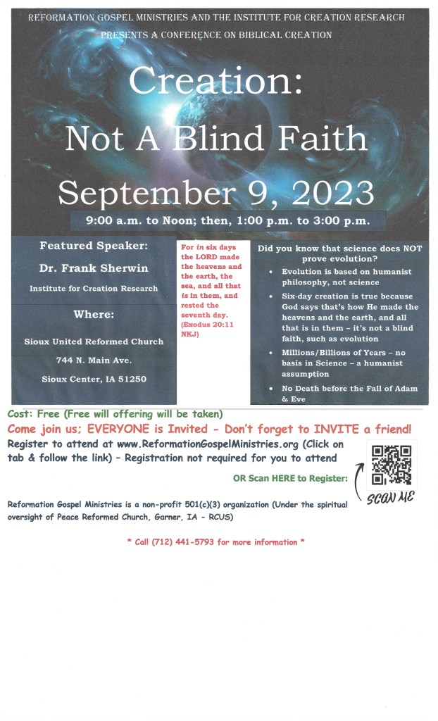Don’t forget to register to attend our free conference on Biblical Creation. Scan the QR Code or go to the web page on the RGM website where you will find the link to register to attend – registration is not required but would be helpful for planning purposes: