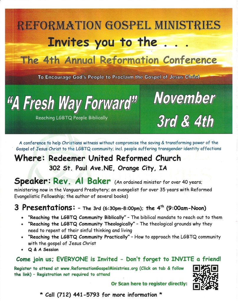 Our next event scheduled is the Fall Reformation Conference, “A Fresh Way Forward” with Rev. Al Baker of Vanguard Presbytery on November 3rd and 4th at Redeemer United Reformed Church, Orange City, IA.