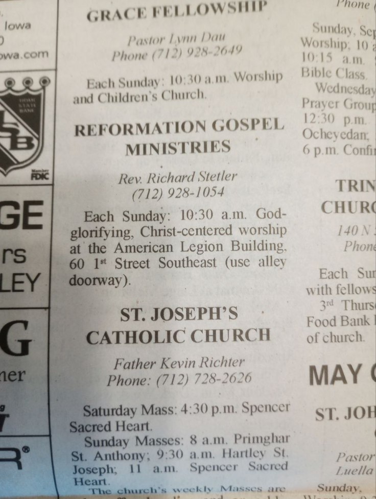 On July 27th we held a Gospel in the Park (“GiP”) at the City Park in Sheldon, IA – Though we had a light turnout for the GiP in July, we received positive feedback with good gospel singing by those in attendance and the gospel message from Isaiah 53, titled “Who is Your Savior.” The message was preached by Rev. Richard Stetler.