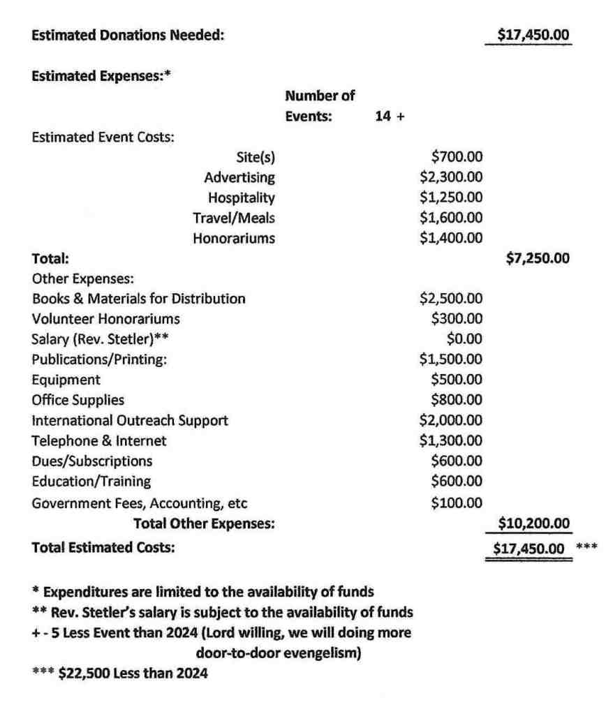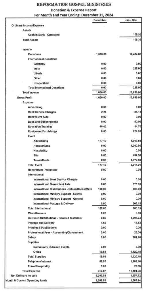 We, again, thank you for support and prayers. Your continued prayers and support are much needed, as we seek to take the gospel message to those “who sit in darkness” under the condemnation of sin in this great nation, and around the world. (The 2024 December & Year End Financial Report and 2025 Budget are also attached below for your review, as you prayerfully consider giving to this labor of love in the Lord for 2025.)