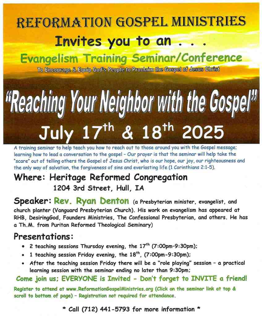 On November 3rd and 4th or the 10th and 11th we will having our annual Fall Reformation Conference. The year the theme of the conference is year will be “Discipleship: The Goal of Evangelism” – we have local pastors making 3 or 4 presentations at this conference that will be held in the evening of those dates. At this time, Revs. van der Hoek, Castro and Anderson have agreed to make presentations. If a 4th presenter is not confirmed, the 4th session will be a Q & A. Make details will be follow later this or next month.