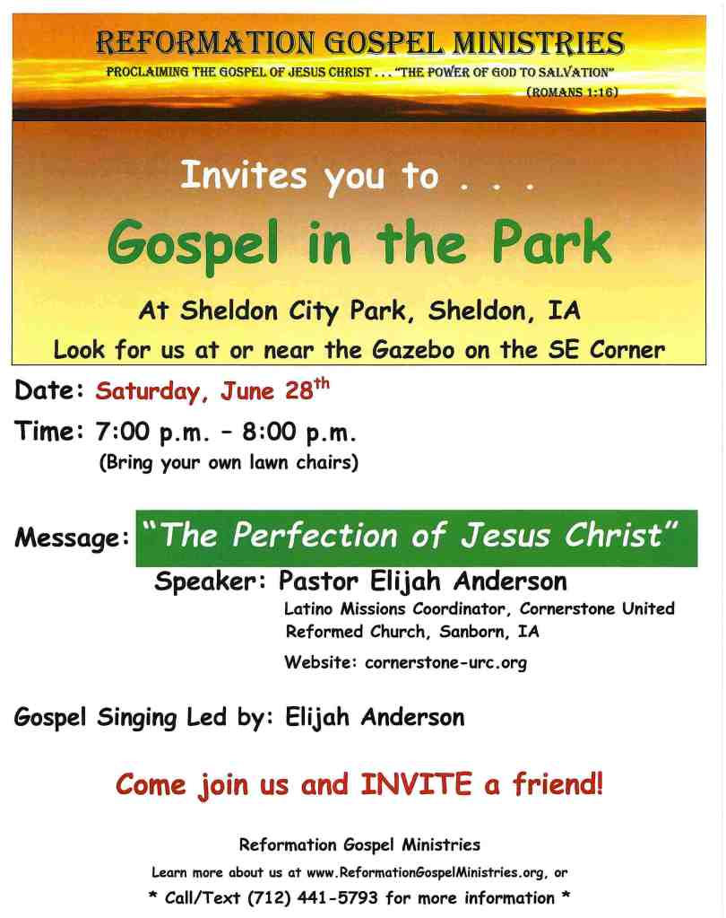 Please keep in prayer our Gospel in the Park, this Saturday at 7 pm at the Sheldon City Park, Sheldon, IA – Elijah Anderson, Associate Pastor of Cornerstone URC, Sanborn, IA and Latino Missions Coordinator will be delivering a gospel message in English.