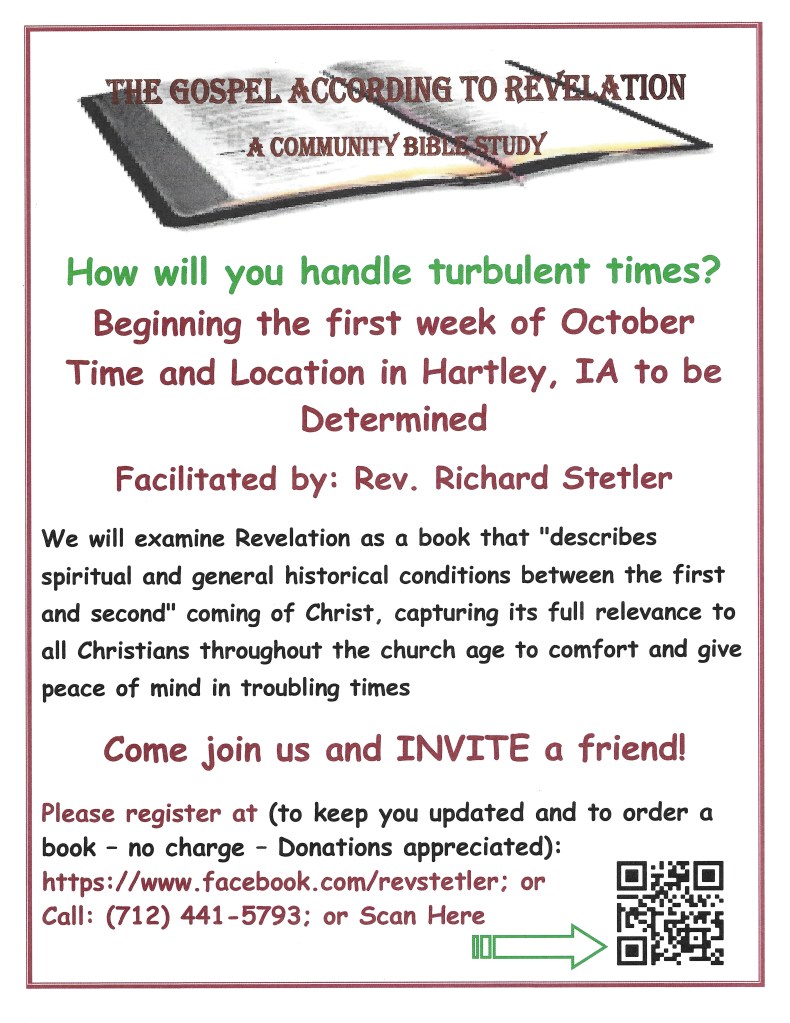 The start of the Bible study has been delayed due to lack of a place to hold it – the City of Harley is proving itself to be antagonistic toward any so-called “religious” meetings, though it will allow a weekly prayer meeting at one of its facilities conducted by someone on the board overseeing that facility.